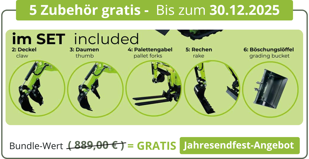 Der Mini Bagger Zipper ZI-MBGS600 hat 12 Monate Garantie(ohne Verschleißteile).